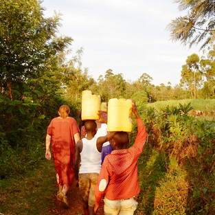 Above left to right: filling water at the 'river' (a pipe in the concrete block); carrying 10 to 20 liters of water uphill to t heir homes. Unfortunately, this water often has parasites.